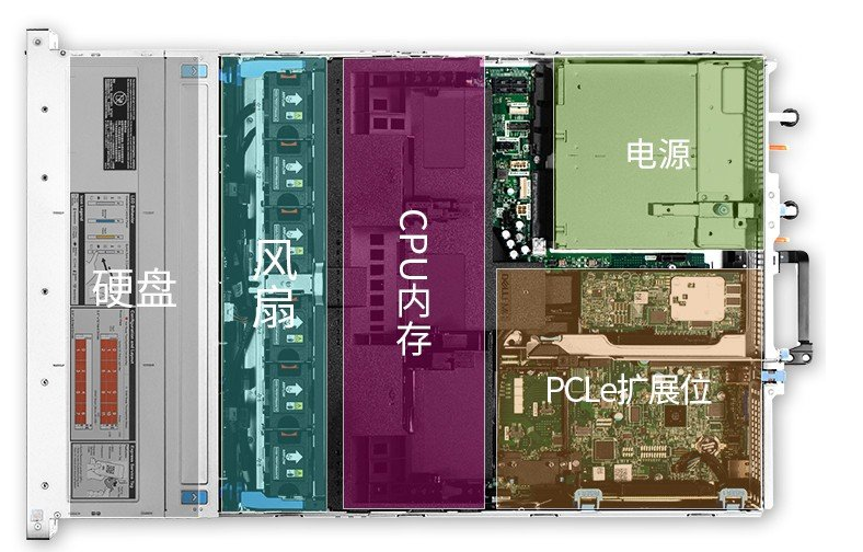 我們打開蓋板看看機(jī)器的內(nèi)部。戴爾機(jī)器整個(gè)機(jī)箱內(nèi)部是非常規(guī)整的,并且也是采用一個(gè)模塊化的一個(gè)設(shè)計(jì),那現(xiàn)在我們先把這個(gè)導(dǎo)風(fēng)罩給取下來,比如這個(gè)散熱模塊可以整組風(fēng)扇一起更換,也支持單塊熱插拔風(fēng)扇,對(duì)于設(shè)備的維護(hù)是非常方便的。cpu 的話,dell R740是一款雙路的機(jī)器,可以支持英特至強(qiáng)系列的,鉑金、金牌、銀牌、銅牌處理器,旁邊呢是24根內(nèi)存插槽,支持 ECC RDIMM內(nèi)存,當(dāng)然不差錢的話還能上單根128 g的LRDIMM內(nèi)存,算了一下的話,總共可以達(dá)到3 tb 的容量,應(yīng)該比你只要的硬盤還要大,可以配備服務(wù)器陣列卡,正面看有三個(gè)選型,h 330 、h 730 1G緩存,h 730 p 2G緩存,建議您預(yù)算不是特別緊張的話,選 h 730 p 2G緩存,硬盤性能體驗(yàn)會(huì)非常好。那后面的話是 PCIe 插槽,這個(gè)機(jī)器呢由于是標(biāo)配,沒有配備RISER卡(上升卡), R740是可以支持8個(gè)PCIe 3.0的插槽,并且可以上三塊雙寬的 gpu 卡,對(duì)于機(jī)架式服務(wù)器來說這個(gè)擴(kuò)展性可以算是非常強(qiáng)了,當(dāng)然以上這些都是需要一個(gè)定制機(jī)型。